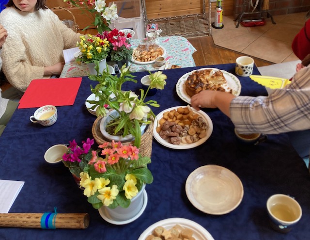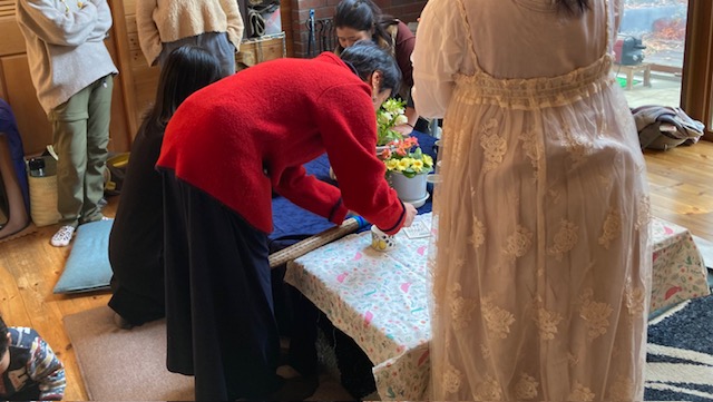 みんなでワイワイ持ち寄ったものを並べて準備していきます。冬なのにお花もきれい。