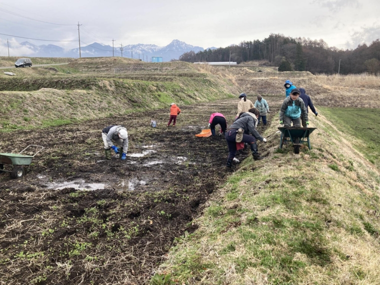秋に田おこしはしてもらったので、表面にでている石を拾います。埋まっている石は無理にとらず、畔たたきを外部にお願いして重機をいれることで押し込んでもらうことにしました。